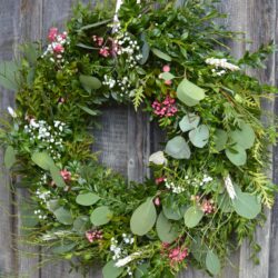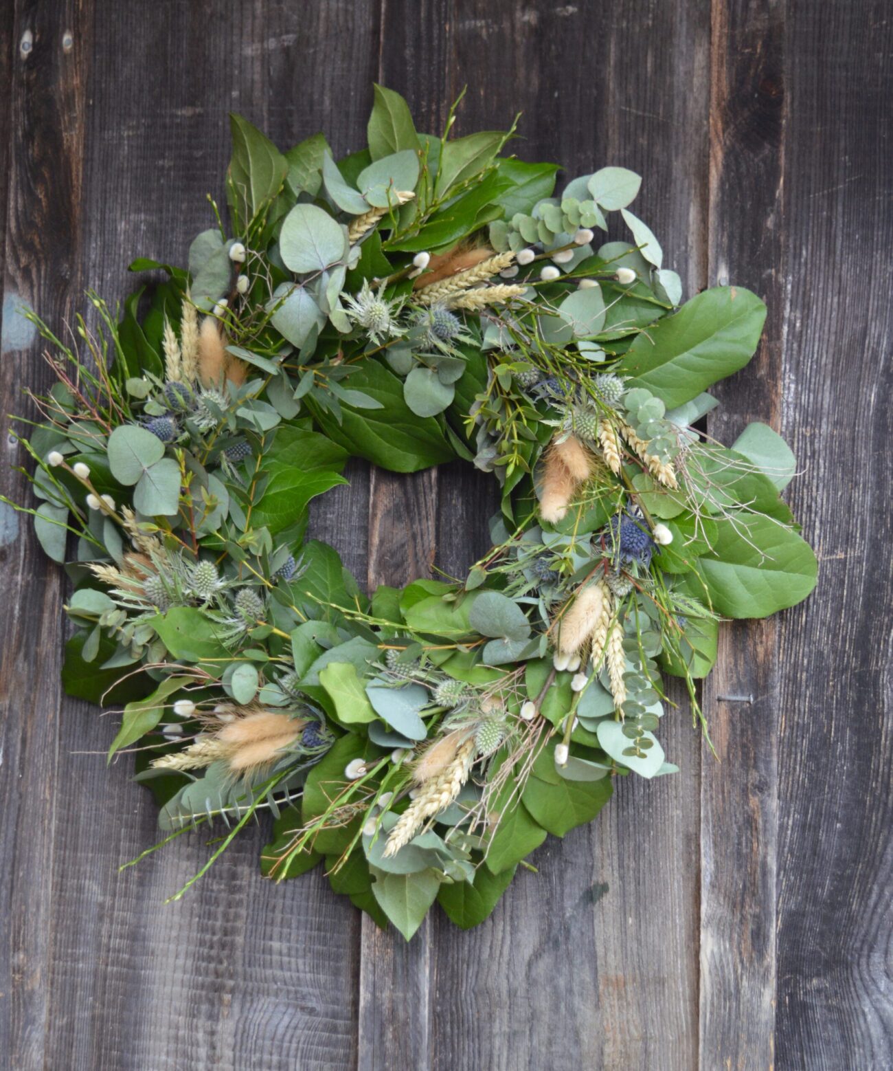 Dieser ca. 40 cm große Naturkranz bestehend aus frühlingshaften Materialien wie u.a. verschiedene Eukalyptussorten, Weidenzweige, getrocknetem Thymian, Lagurus, grüne und blaue Disteln sowie Heidelbeere ist ein schlichtes Landhaus-Unikat und eignet sich besonders gut als Türkranz.